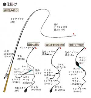 | 磯釣りでは、イシダイとイシガキダイをまとめて石物という。1?以上の型が掛かった時には、三 段引きと呼ばれる強烈な引きが楽しめるので、夢中になる釣り人も多い。 さまざまな仕掛けも用いるが、イシダイザオにドラグ性能の優れた強力な両軸受けリールを使用 するのが基本。イシダイは、沖めの沈み根や溝、ハエ根などに生息するので、やや遠投も強い られる。両軸受けリールの遠投ではバックラッシュを起こさないよう、糸が出ていくスピードをサ ミングで調整する。投入したら置きザオにして、リールのドラグを締めてアタリを待つ。 最初のアタリはこつこつと小さいが、その後にサオ先を引き込むようなアタリが続くので、ここで サオを大きくあおって合わせる。糸がたるむと根に潜られるので、サオをポンピングしながら一気 に巻き上げる。 |