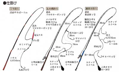 | 磯や堤防からは、フカセ釣りかウキ釣りでねらう。フカセ釣りは、5m前後の渓流ザオに2号くらい の道糸を用いる。ポイントは潮通しのよい根周りや、海藻が繁茂する所などで、波の穏やかな日 のまずめ時(日の出、日没前後)がねらいめ。この釣り方は、岸際の船の夜釣りでも行われる。 食いがよくなると、魚が餌を求めて上がってくるので、タナが底層から表層まで移ってくる。メバル は夜行性なので、電気ウキを用いた夜釣りも効果的だが、足場の悪い磯では危険が多いので、 主に堤防で行われる。餌はいずれもモエビやイソメ類を使う。 また、メバルはロックフィッシュ(根魚)としてルアー・フィッシングの対象魚でもある。ソフトルアー をつけたジグヘッドリグが一般的だが、ミノープラグなどでねらうのもおもしろい。根掛かりを恐れ ず底の岩礁帯を果敢に攻めること。眼のよい魚なので、できるだけ細めのラインを用いたい。 船釣りでは生き餌釣りや、枝バリを6〜10本つけた胴突き仕掛けの釣りをする。生き餌釣りでは 2本バリにつけたイワシを泳がせてメバルを誘う。イワシを弱らせないように、軟らかめのサオを使 うのがこつ。胴突き釣りでは、最初のアタリですぐにサオを上げずに追い食いをさせること。 すべての枝バリにメバルが掛かることもある。 |