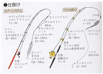| 国内で一般に釣りの対象魚とされるのは、2〜10kgくらいまでの「ヨコワ」、「メジ」などの若魚と 、20〜60kgくらいの2、3年魚。100kgを超える魚は回遊域が異なることから、トローリングや職 漁の対象とするのが一般的といえる。 10kg未満のメジでは、中〜底層に魚群がいる時は、片天ビン仕掛けの寄せ餌釣りが一般的。 ハネ(水面に追い上げた小魚を食べている状態)が確認できる場合には、擬餌バリの曳き釣り や、キビナゴ、オキアミなどを使ったフカセ釣りになる。20kg以上の魚はアタリの後、急激に数 百メートルも潜る。これをラインを出してしのぎ、魚が水圧調整するために引きが一瞬弱くなる 時をきっかけにやりとりを開始する。 |