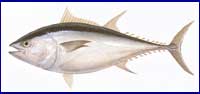 | マグロ類の中では最も胸びれが短く、先端は第2背びれの基部まで達しない。若魚期には腹 部に白い横縞があるが、成長するに従って不明瞭になり、やがてなくなる。外洋の表〜中層を 群泳しているが、季節によっては沿岸域にも近づく。魚類、イカ類、小型の甲殻類などを餌とし ている。日本、世界の温帯〜熱帯海域に分布するが、インド洋や南半球では少ない。北大西 洋産のものは、別の亜種として区別する研究者もいる。マグロ類中最大になり、全長3m、体重 680kgに達するものもある。 沿岸に現れる若魚は、定置網、巻網、釣りなどで、外洋にすむ大型魚は、主に延縄で漁獲 される。遠洋漁場で行われる延縄漁法は、枝バリ2000本以上、幹糸の総延長140kmにも及ぶ 大規模なものである。 |