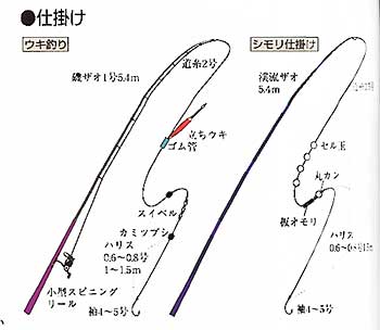 | 塩分の濃い所を好む魚なので、大きな河川の流れ込むような場所は嫌う。波の静かな小磯や 岩礁帯の堤防周りで、海藻の繁茂する場所が好ポイント。アミと配合餌を混ぜて寄せ餌をつくり、 少量ずつまきながら魚を寄せてウキ釣りをする。つけ餌はイソメ類やオキアミなど。 ポイントが足元近くの場合は、硬調の渓流ザオにシモリ仕掛けで釣る。この釣り方はウミタナゴ の微妙なアタリをとらえやすい。 ポイントが遠ければ、磯ザオとスピニングリールを用い、立ちウキ仕掛けで釣る。立ちウキに現れ るアタリは、食いがよければウキが消し込むが、ふっと止まったり、食い上げて横に寝ることもある。 |
