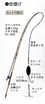 | 船釣りが基本で、主にカットウ釣りでねらう。フグ類のカットウ釣りは、餌をつけた上バリより10cm ほど下にカットウバリをつける。上バリにつける餌はバカガイ(アオヤギ)やアサリのむき身など。 フグ類は口が小さくハリ掛かりしづらいので、上バリの餌をつつくわずかなアタリに、素早く合わ せて下バリで引っ掛ける。餌釣りでねらう場合には、オモリを着底させたら50cmほどタナを切り、 餌を上下させて誘いながらアタリを待つ。 ハリ掛かりしたらリールを一気に巻かないと、鋭い歯でハリスをかみ切られるので注意。餌はカッ トウ釣りと同様。 |