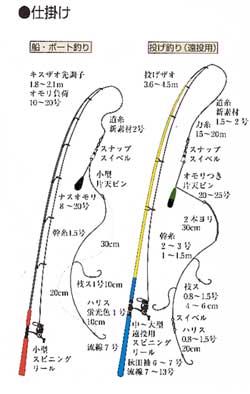 | 砂浜や堤防からの投げ釣り入門コースの対象魚のひとつ。投げ釣りの盛期は夏で、海に向かっ て思いきり遠投する爽快感が人気の釣りでもある。船釣りのシーズンも夏で、投げ釣りより大型が 釣れる。遠投しなくてすむので、魚のアタリを敏感にキャッチできる先調子のキスザオを使う。 投入したら少しずつリールを巻いて手前に引いてくる。 このスピードが遅すぎると、シロギスより動きの鈍いメゴチ類が釣れてしまう。 砂底で餌を捕食する魚なので、投げ釣りには波が穏やかで、潮が澄んでいる日が適している。 海底の状態によっては海岸から30mくらいのポイントでも釣れるが、時には100mもの遠投も要求 されるので、3.6〜4.5mの投げザオに中〜大型遠投用スピニングリールを組み合わせる。仕掛け を投入して少し手前に引いてくると、オモリをやや重たく感じる場所がある。このヨブ(砂底の起伏 )でしばらくアタリを待つ。アタリがなければさらに手前のヨブを探る。 餌はイソメ類など。大型をねらう場合には、アサリのむき身を使うこともある。 |