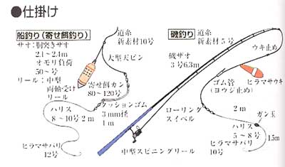 | 船釣りでは、イワシのすり身やアミを使った寄せ餌釣りや、生きエビを餌にしたシャクリ釣りなどを する。寄せ餌釣りの場合は、比較的胴調子のサオを置きザオにするとよい。最近では、ルアーの バーチカル・ジギングでねらうことも多く、トレバリー・フィッシング(体高の高い大型のアジ類をね らうルアー・フィッシング)の対象魚としても人気がある。 磯釣りの対象としては、釣り人に最も喜ばれる魚のひとつで、普通、2〜3kgのものをねらう。 初秋から早春がシーズンだが、この季節は海が荒れるので、慎重な天候判断が要求される。 ヒットした時の引きが強烈なため、サオやリールはパワーのあるものが必要。強い引きの割に 口が弱くて切れやすいので、仕掛けにはクッションゴムをつけて、ドラグ性能のよい両軸受け タイプのリールを使用するとよい。 餌はオキアミなど。 |